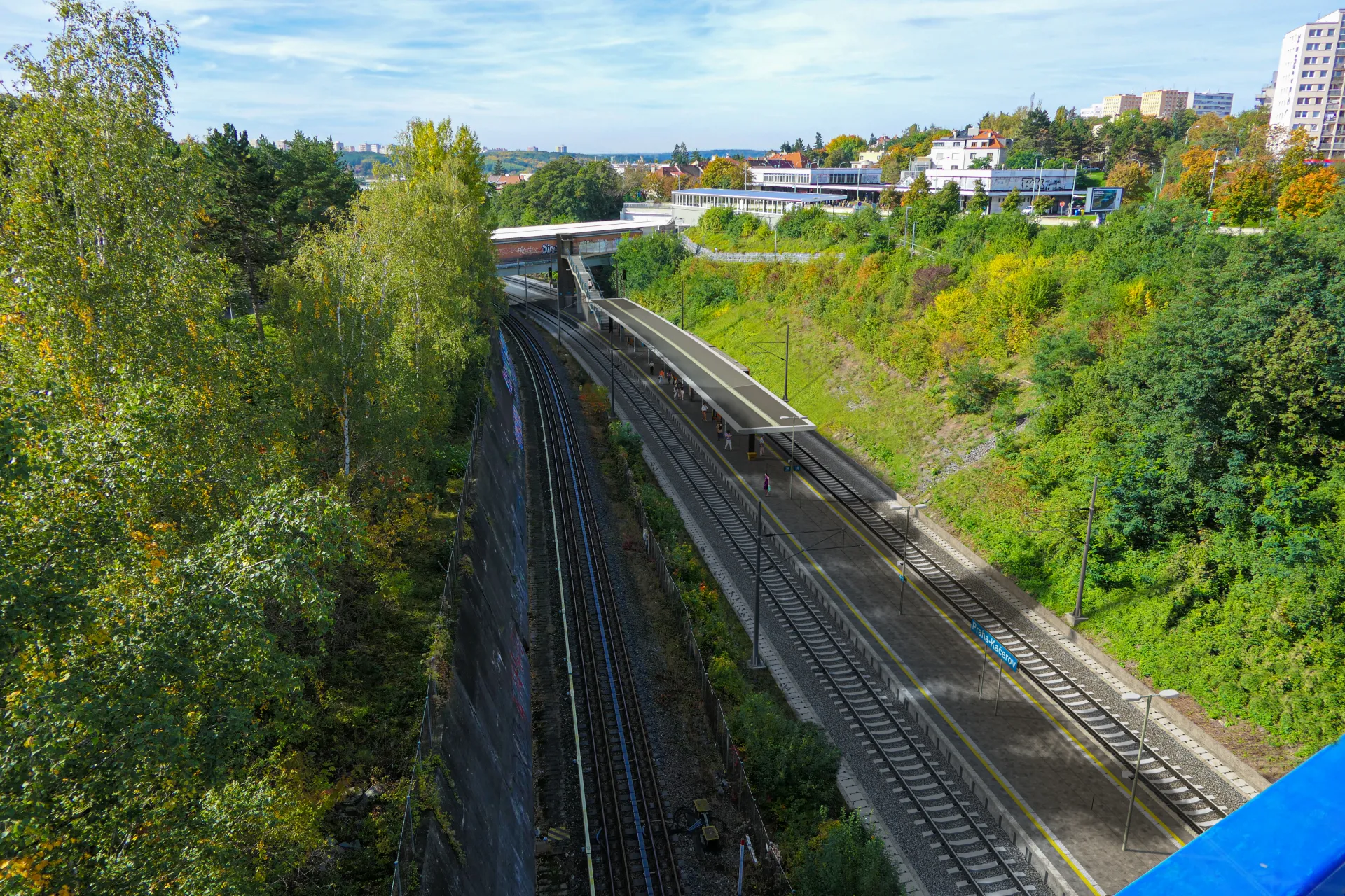 V zastávce Praha-Kačerov je navrženo nové ostrovní nástupiště délky 220 m. Přístup na nástupiště je zajištěn prostřednictvím nové lávky a schodiště, pro zajištění bezbariérového řešení je součástí stavby nová lávka a výtah pro cestující.